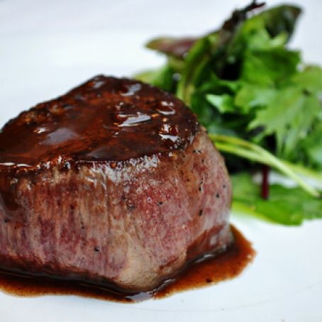 Spoon mushrooms over each steak and pour the red wine jus on top.