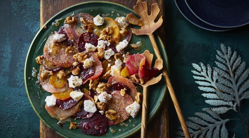Read moreA simple beetroot salad -thin slices of sweet, earthy beetroot are slicked with a mustardy dressing and topped with tangy goats’ cheese. Using rainbow beetroot makes it a little extra.