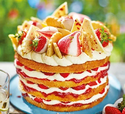 This generous cake is big enough to feed a crowd and is a combination of all our favourite summer ingredients: strawberries, Victoria sponge, meringues, fresh cream, white chocolate and buttery shortbread