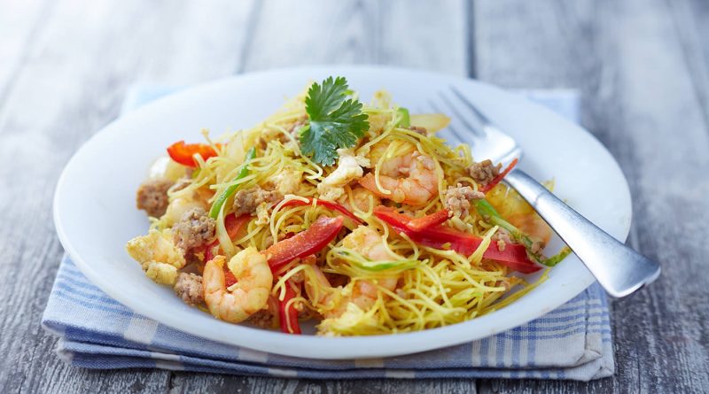 Read moreWith its signature curry flavour and yellow hue, Singapore Noodles are made with thin rice noodles, prawn / shrimp, egg and red peppers.