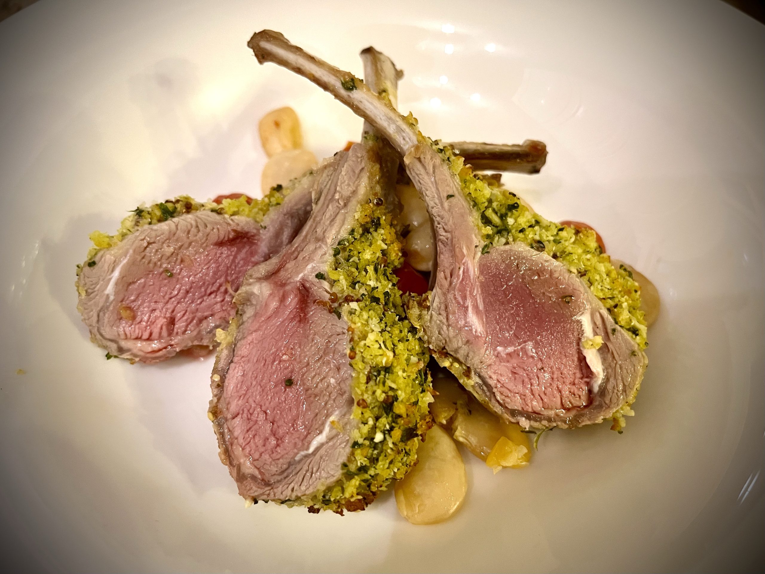 Giving the traditional roast a spin with this rosemary & garlic encrusted rack of lamb, served over Butter Beans and Roast Tomatoes