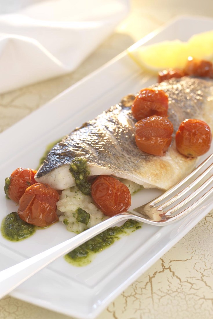 Grilled fillets of sea bass with herb risotto, roasted cherry tomatoes and pesto