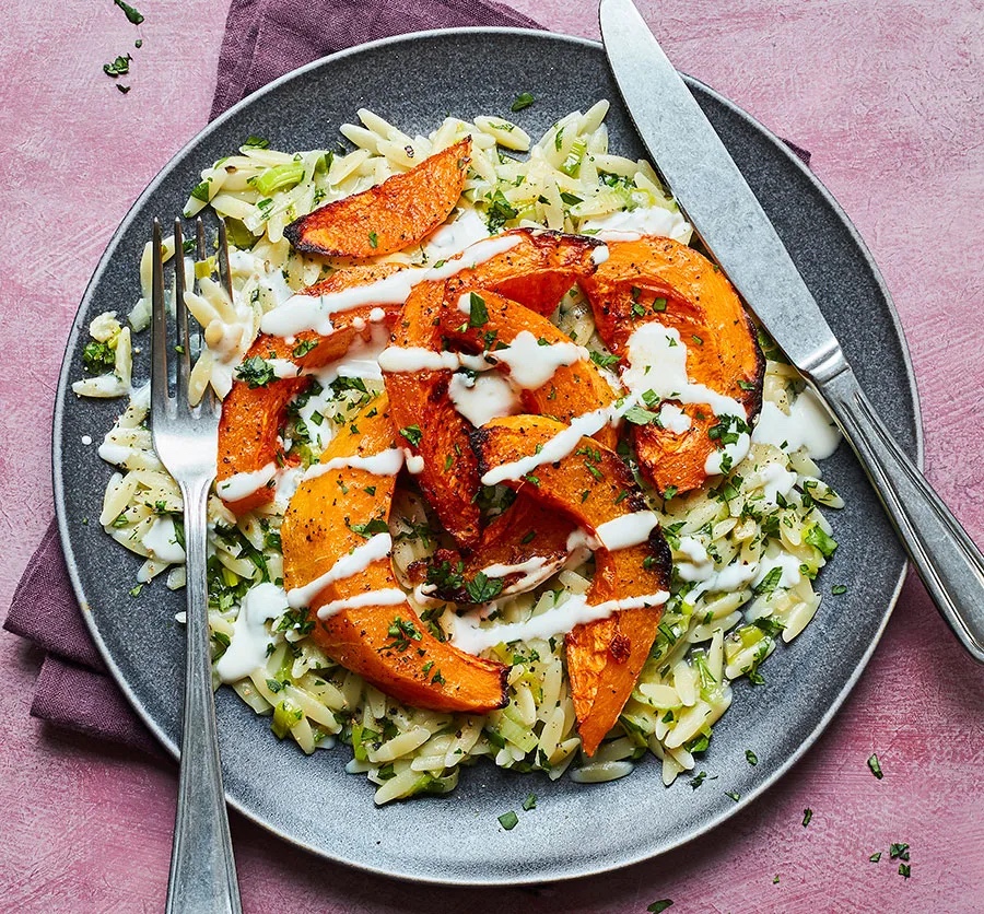 Enjoy roasted squash wedges served with orzo and a roasted garlic, lemon and feta sauce. Packed with flavour, it’s a great veggie dinner for two